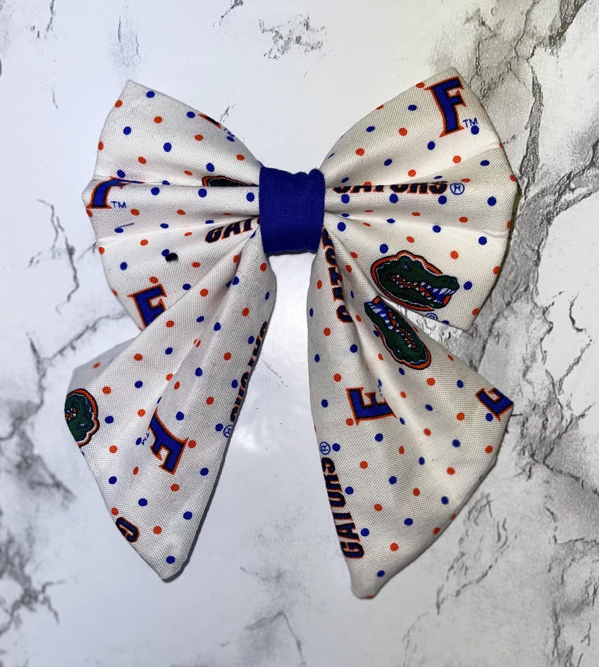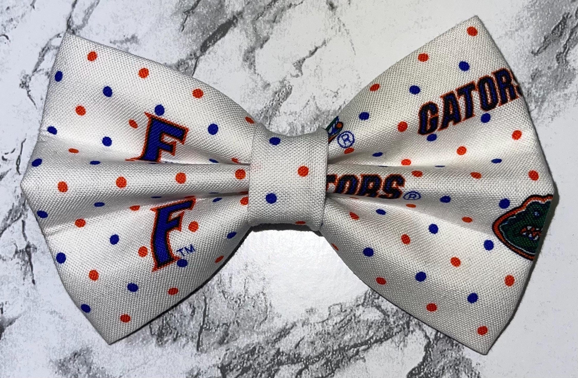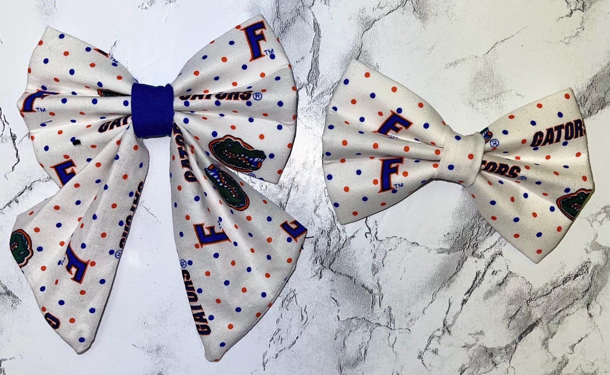 Get your fur baby ready to cheer in style with our vibrant collegiate wear! Made from high-quality materials, these bow ties and sailor bows in the team's colors will make your baby the star of the game day festivities. Order now to show off your team spirit together! 🐾Elastic straps allow you to run the collar through Can fit up to a 1.75” collar depending on the size purchased 🐾All items are handmade with love and some imperfections! Bow tie pattern may vary depending on the cut if the fabric! 🐾Laundry Care Mesh laundry bag for delicate items, hand wash, or spot clean Air Dry Only 🐾Caution Please do not leave any fur baby unattended while accessorized! 🐾Sizes (approximate) Bow Tie: Small 2.75” x 2.25” Medium 4.25” x 3” Large 6” x 4.25” Sailor Bow: Small 4” x 4” Medium 6” x 5” Large 9” x 6.5” 🐾!!ALL SALES ARE FINAL!!🐾 Thank you for shopping with Dog E Dog World