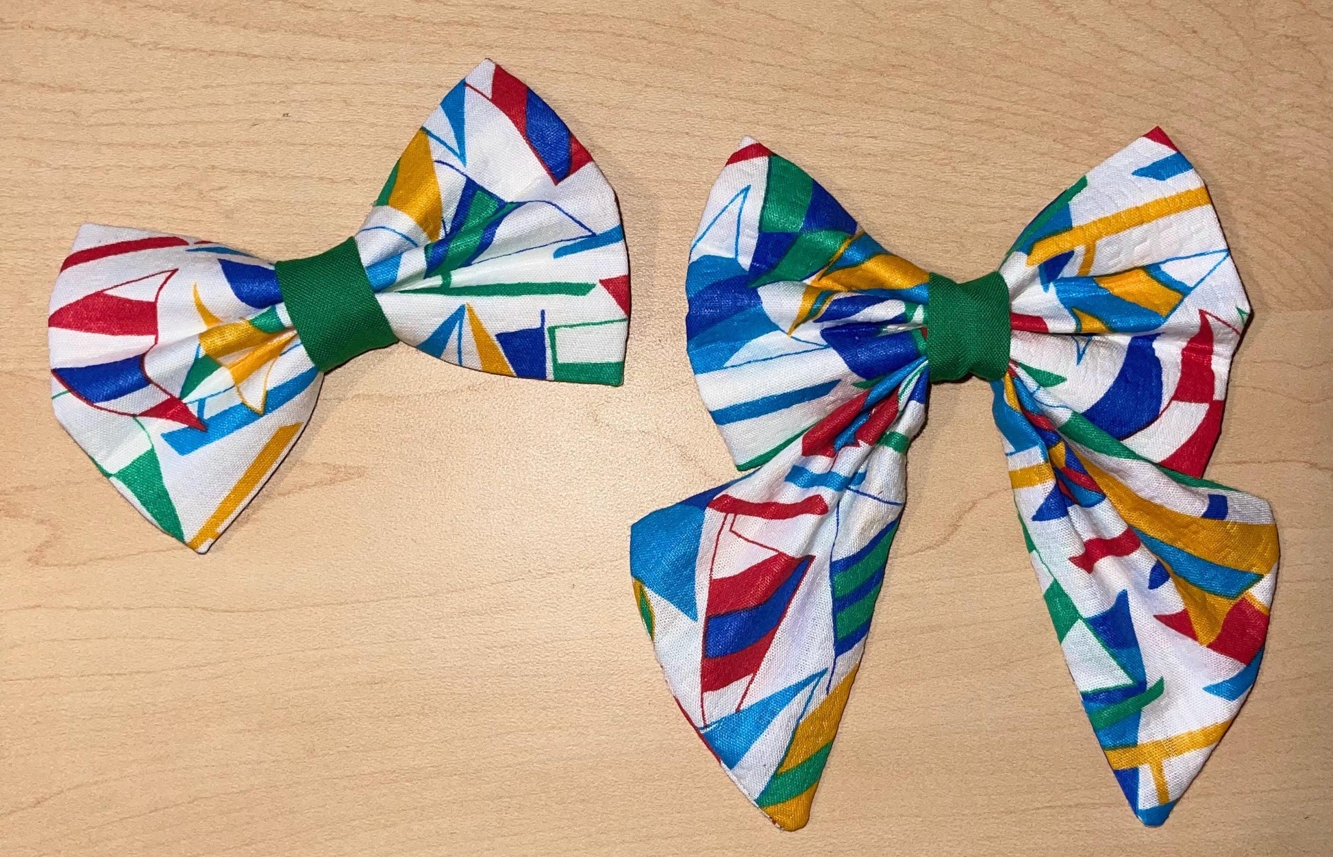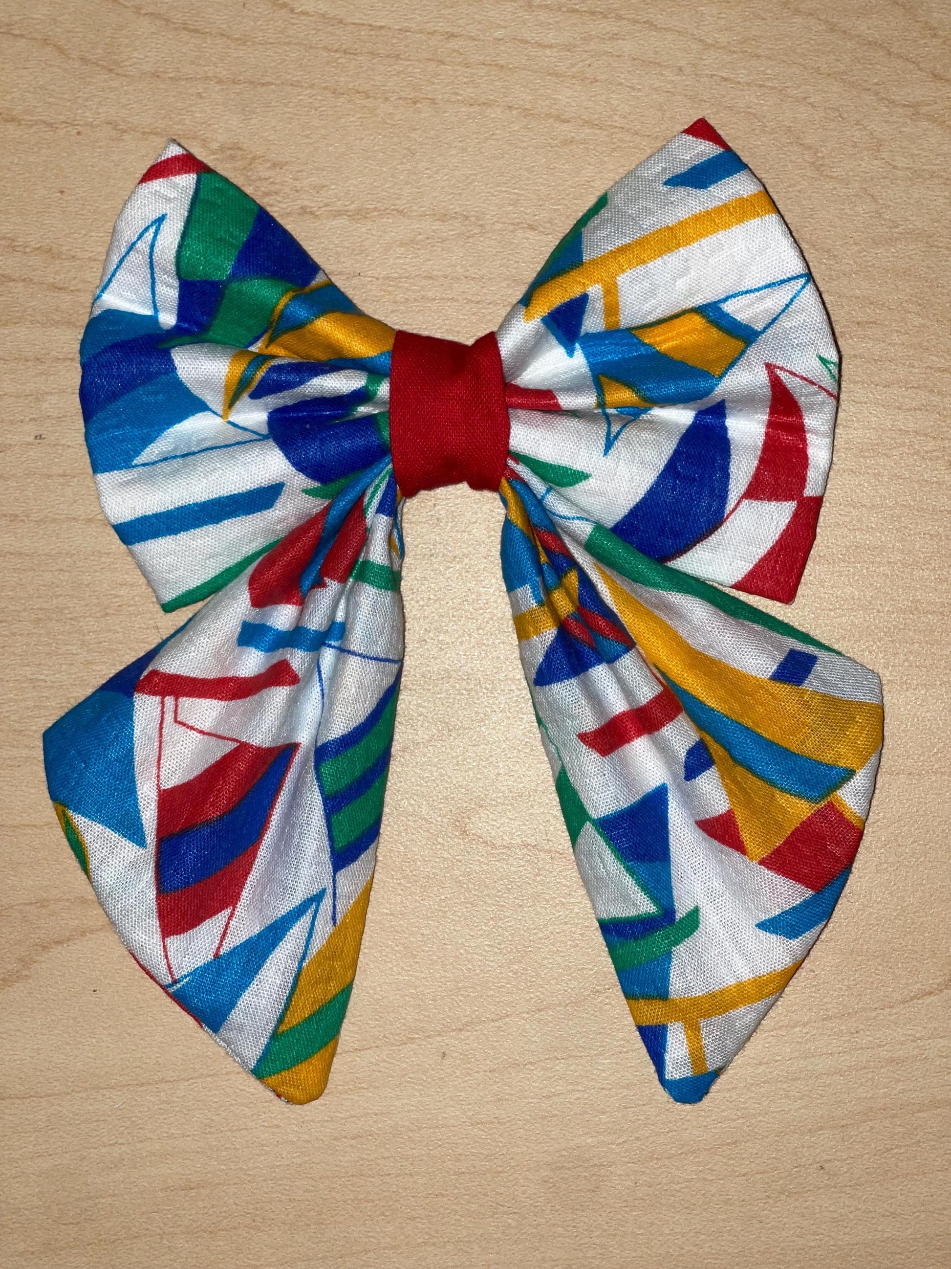 The Colorful Sailboats Bow Tie is a lively accessory for your baby, designed to capture the essence of spring and summer. Set against a classic seersucker fabric, the vibrant sailboat pattern brings a sense of fun and adventure to your fur baby's look. Available in both traditional bow tie and sailor bow styles, you can choose between a green or red center piece for an extra pop of color. This accessory is perfect for adding a touch of nautical charm during the warmer seasons!