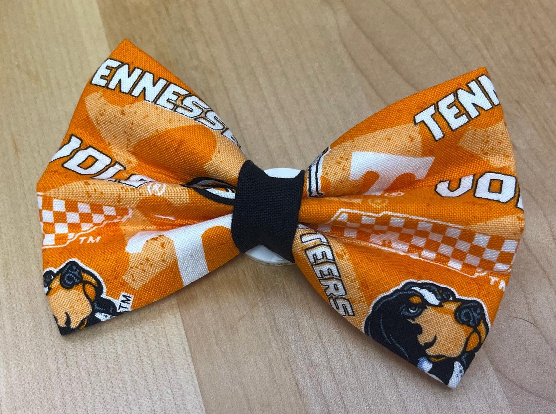 Gear up in style with University of Tennessee collegiate wear featuring the iconic Tennessee Vols colors of orange, black, and white. Show your school spirit on game day or during football season with a trendy bow tie or sailor bow for your fur baby. Elevate your fan fashion and represent your team proudly!