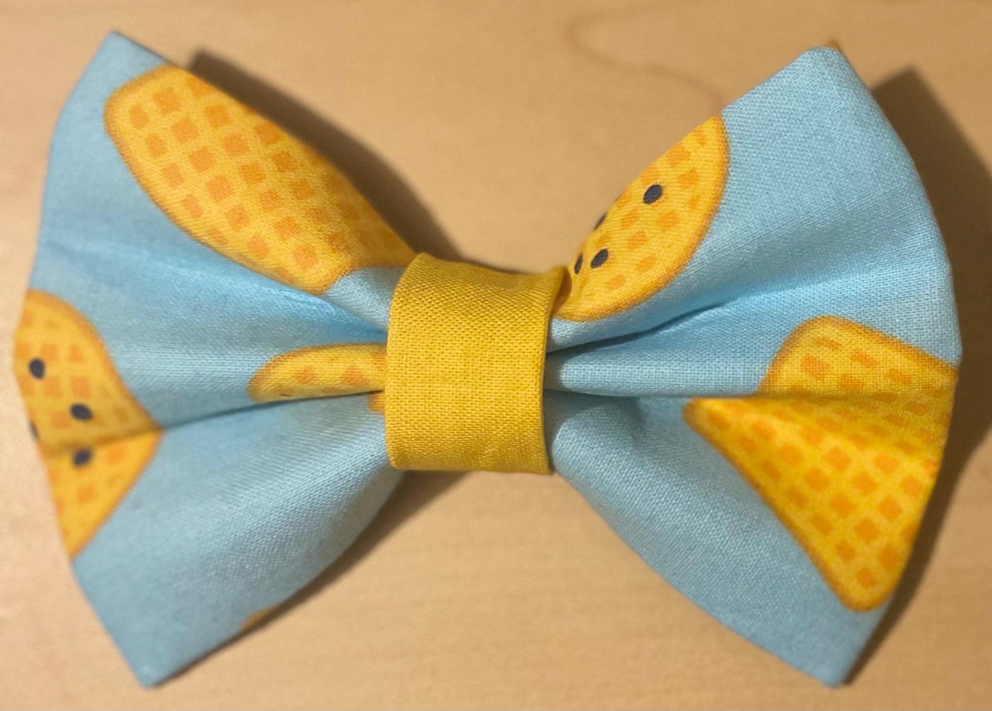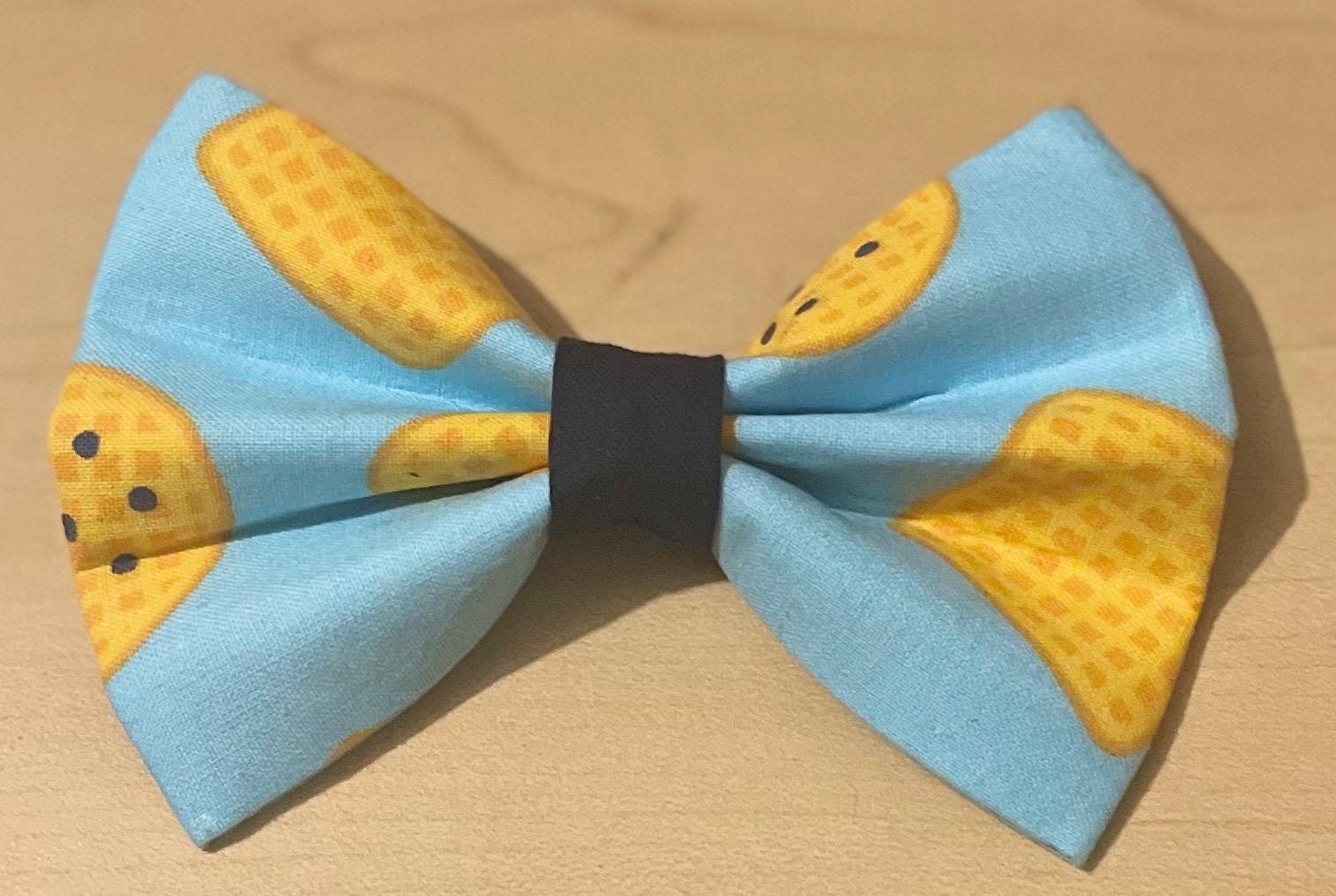 The Waffles Bow Tie features a playful sky blue background adorned with golden waffles, making it a fun accessory for your fur baby. It is available in both traditional bow tie and sailor bow styles, allowing you to choose the look that best suits your pet's personality. With the option of a yellow or blue center piece, this bow tie adds a customizable touch. It also serves as a great accessory to complement our Woofle pet treats, making it perfect for any occasion.