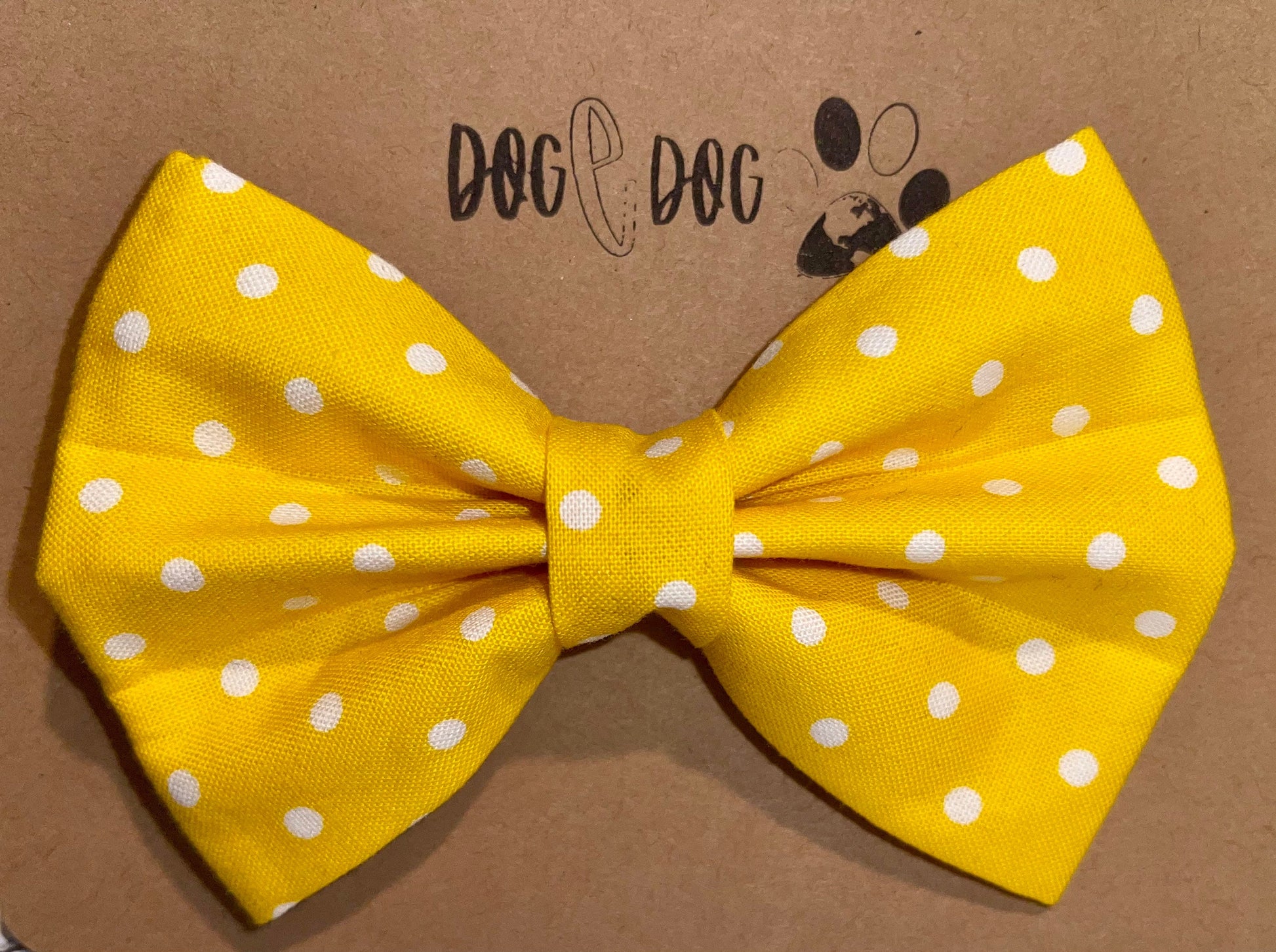 Make your pet stand out from the crowd with our Pet Bow Tie from the Dots, Dots, and more Dots collection. This charming accessory is perfect for both dogs and cats, adding a touch of elegance to their appearance. The bow tie has a beautiful yellow color with white polka dots that will surely catch anyone’s attention.